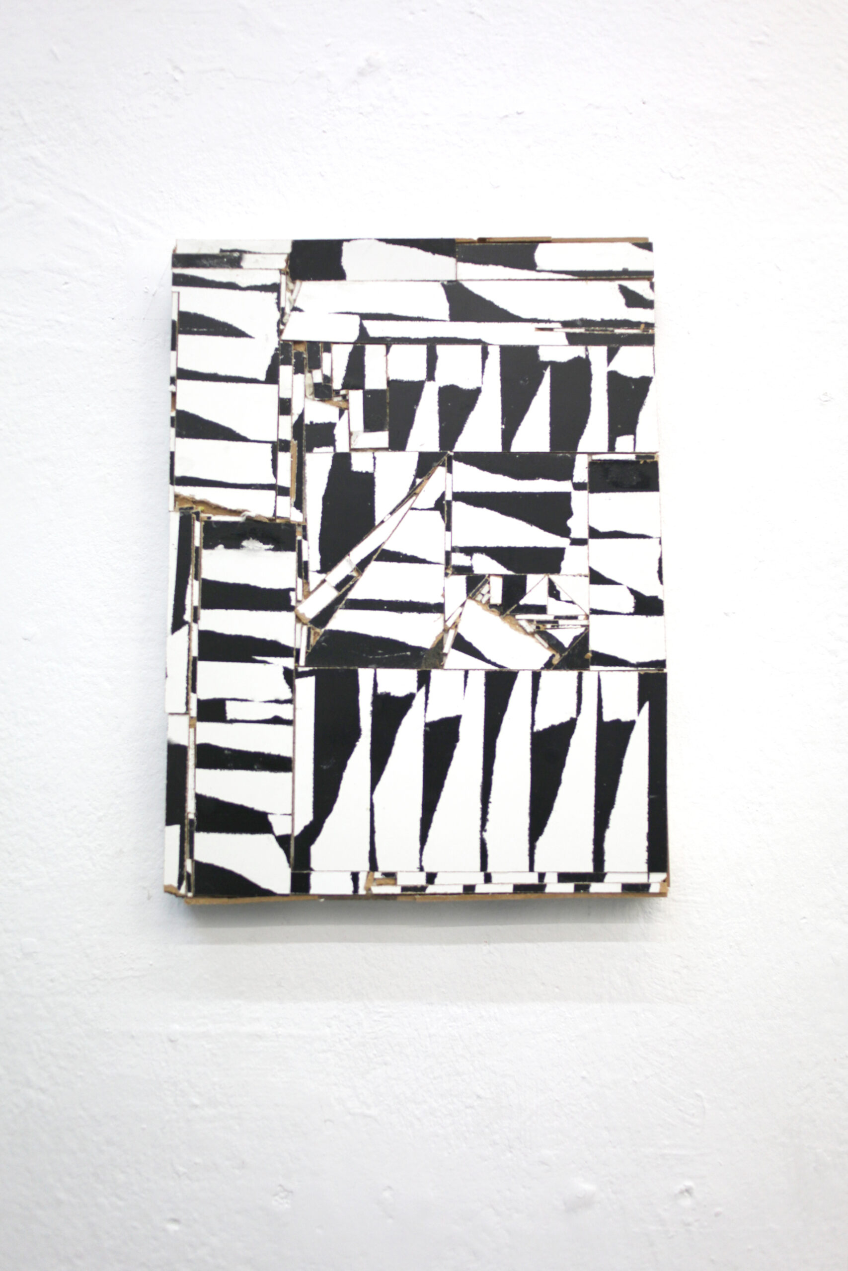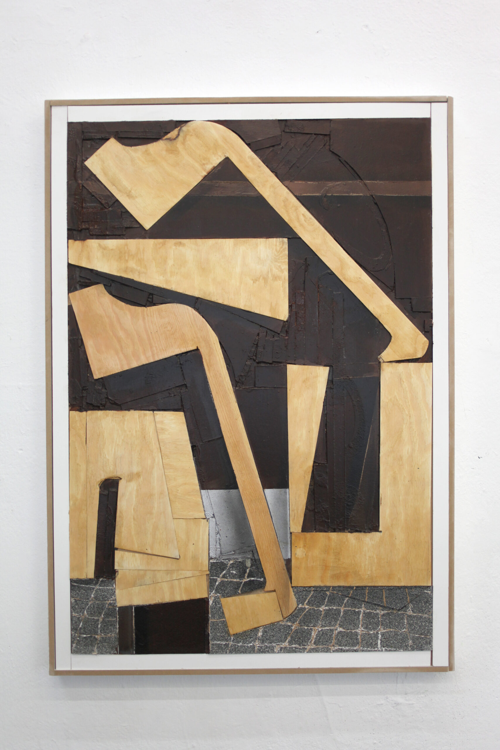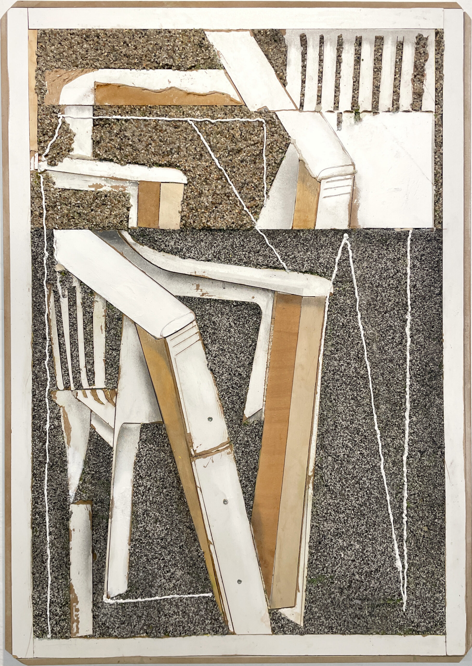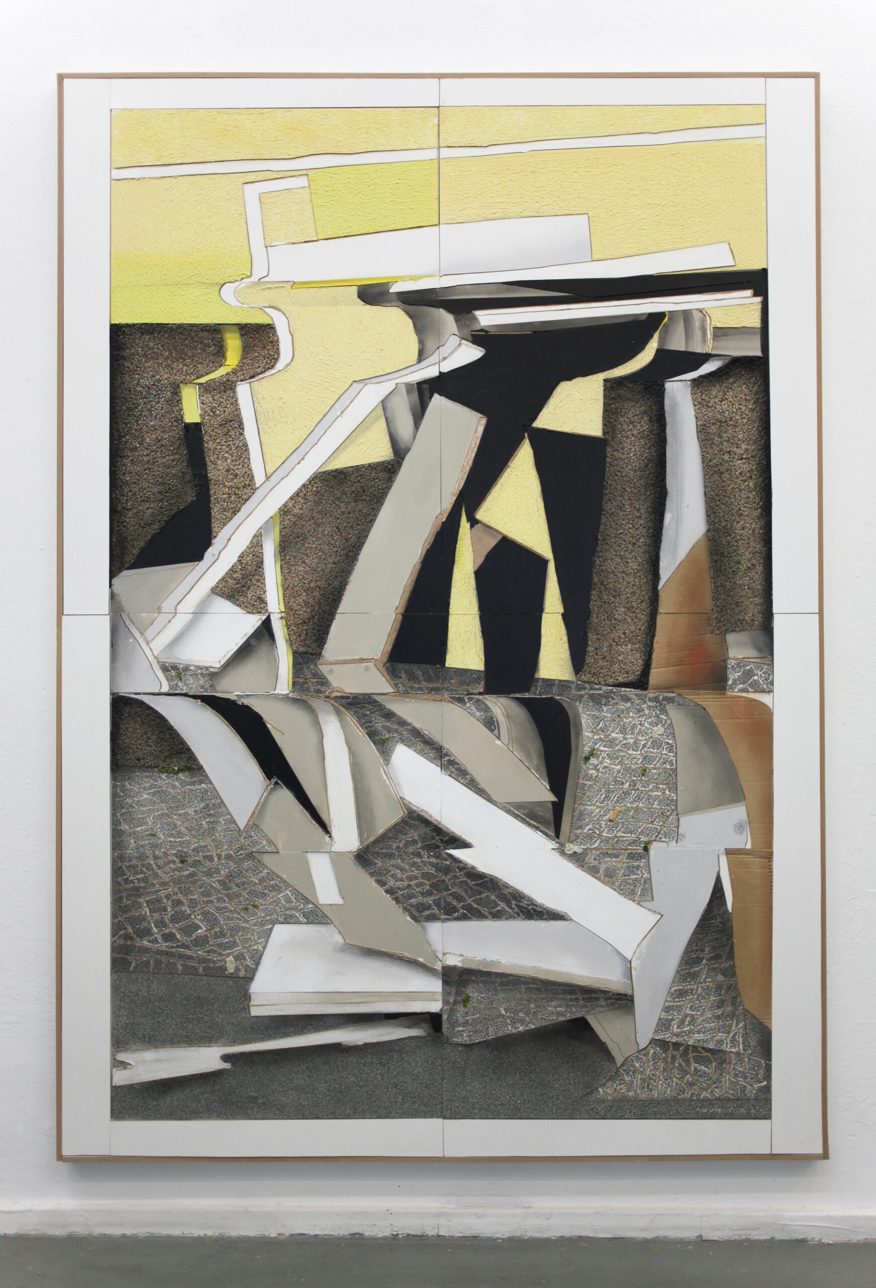 Angelehnt an seine frühere Praxis, dem Umbau des vorgefundenen Materials vor Ort und der anschließenden Dokumentation des plastischen Ergebnisses, dreht der Künstler heute den Prozess um. Das Foto der Szenerie wird doppelt gedruckt, neu collagiert und dann wieder eingescannt, um anschließend als Wandarbeit materialgetreu nachgebaut zu werden. Oder anders ausgedrückt: Hier wird ein Stück Stadt ausgeschnitten, umgekrempelt und als einfaches abstrahiertes Stillleben reproduziert. Das refined refurbishment, wenn man will.