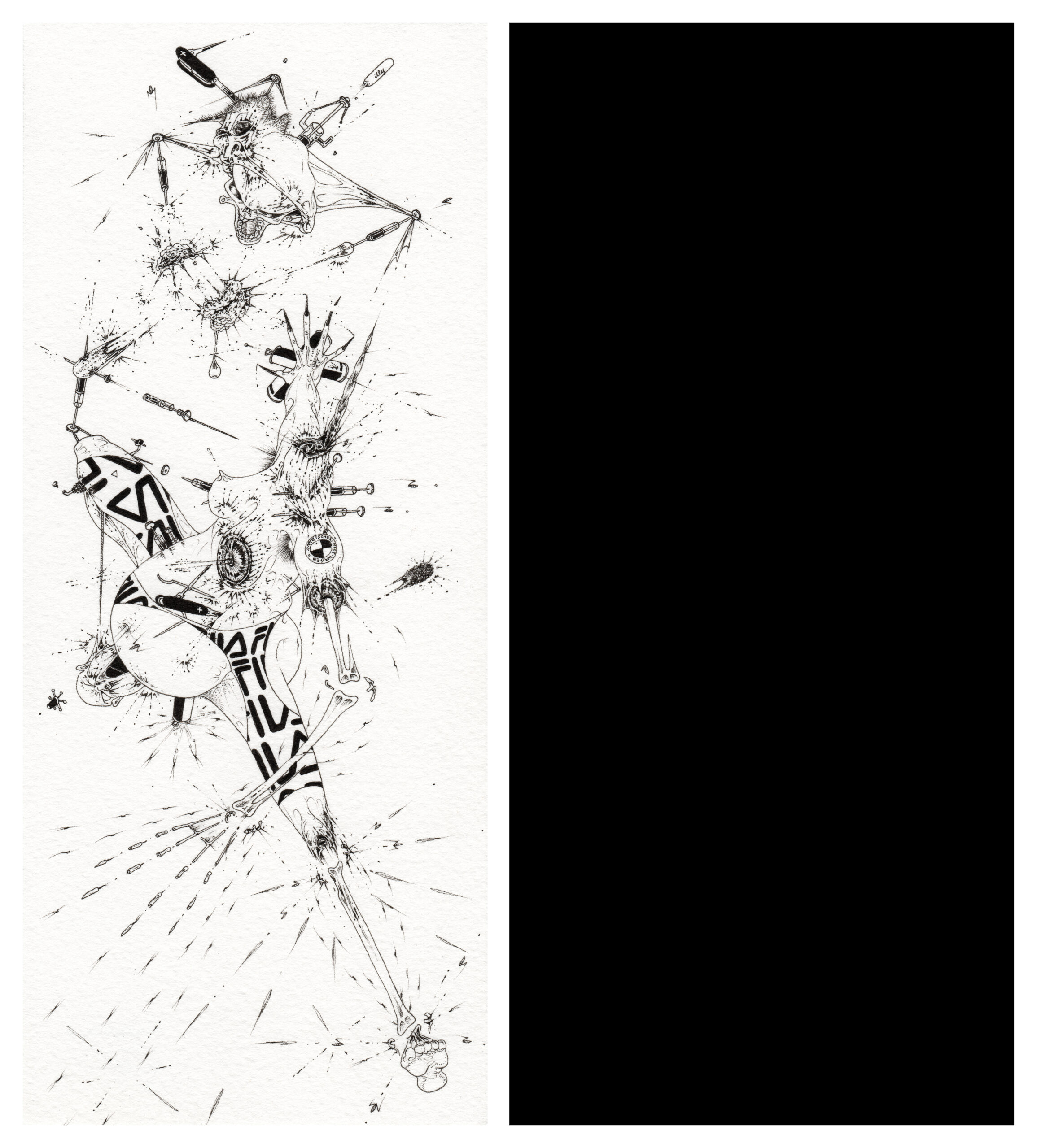 Thus Ziervogels works communicate, despite all the pressure, tearing and ripping, which can also be found in them, a sense of a form of “equilibrium”, which however is not resting within itself but which arises from the painstaking balancing of the forces that take effect on the paper. Here everything seems to be longing to explode or implode, often even both at the same time, but the controversial elements are nevertheless brought to a fragile balance in the end. The secret lies in the inversion of the inside to the outside, the entrails into the visual space of the picture into the room and back: Before and thereafter are merging in the picture, the inward is outward and the outward is inward. Strictly speaking neither exists since Ziervogels pictures are analogies of an embracing and complete interior of the outward, within which everything constantly changes to its contrary – here everything takes place on the same surface and an equilibrium is reached by an equal treatment of all aspects. But for that the bodies first have to tear apart and spit their bowls and guts onto the canvas so that they can be carried into a balanced compositional arrangement – similar to Louis Bunuel’s cut through the eye at the beginning of Un chien andalou, which as a dramatic inauguration makes it only now possible that the view can turn inwards, finding the well known insanity and bringing it to the surface where it can happily multiply and reproduce associatively copulating. – an equilibrium rooted in a radicalness – with a persistent urge for continuous dissolution. All tends towards zero, swallows itself, turns inwards and convulsively immediately back outwards, disappears in the asshole of the world only to be reborn out of the mouth as a half-digested negative of a slide picture. Everything is pushing to dissolve, disappear and to reappear only to disappear again: a circular equilibrium in contrast – black on white. White on black. Black on white. White on black.